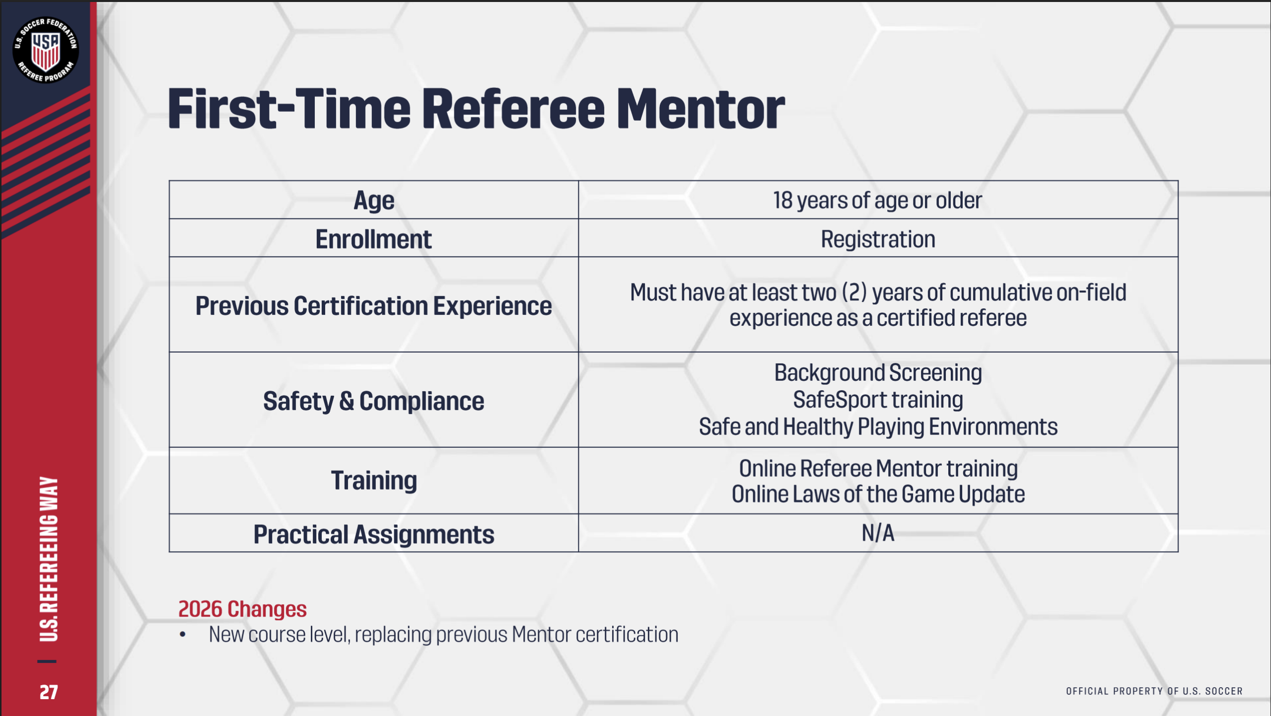 Courses will not be offered regularly. Approval to take a mentor course must be approved by the SDA and may be denied without reason. Instructional material will be online through the US Soccer Learning Center. Mentors must then complete three in-person, practical assignments of leading a video analysis session, leading a practical exercise and observing the performance of match officials.