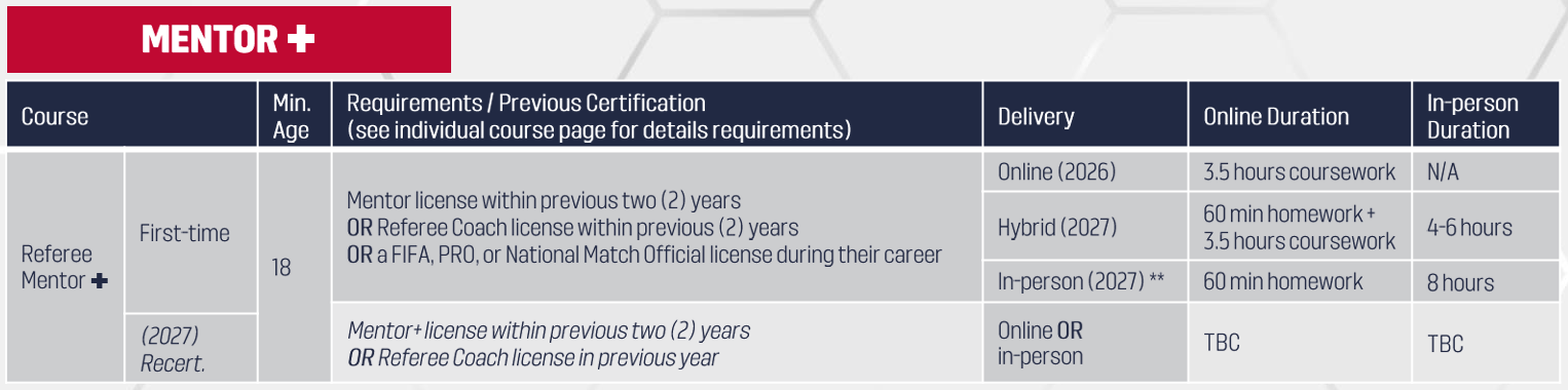 - Collaborates with State Referee Programs, and/or U.S. Soccer in training new or experienced Referee Mentors/Mentors+ and Referee Coaches