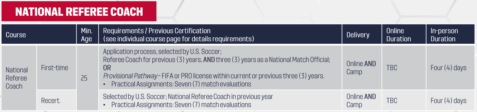 - U.S. Soccer National Referee Coach Camp – four (4) days