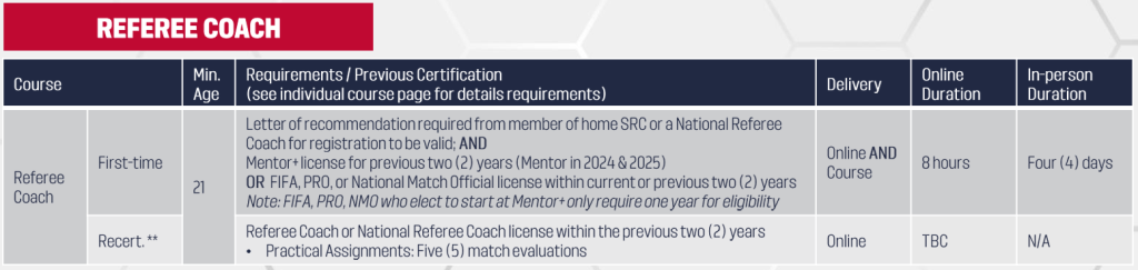 - U.S. Soccer National Referee Coach Camp – four (4) days