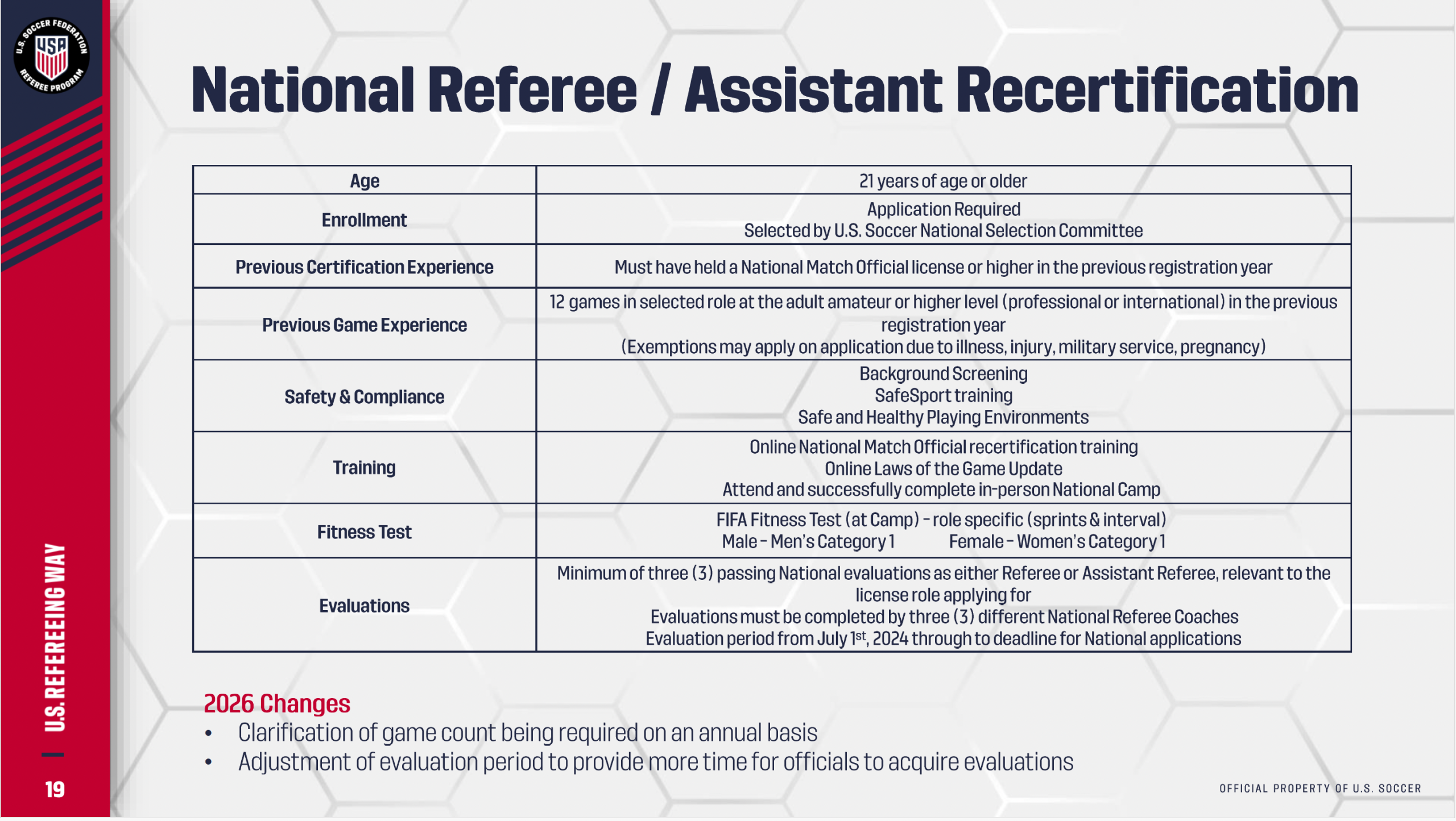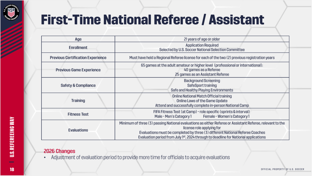 “In alignment with international standards—and the realities of the game itself—fitness testing will now (starting with 2026 Registration year) be conducted on the field, where referees do their work. This adjustment better reflects the physical demands of officiating and ensures we’re preparing you in the environment that matters most.” -U.S. Soccer
